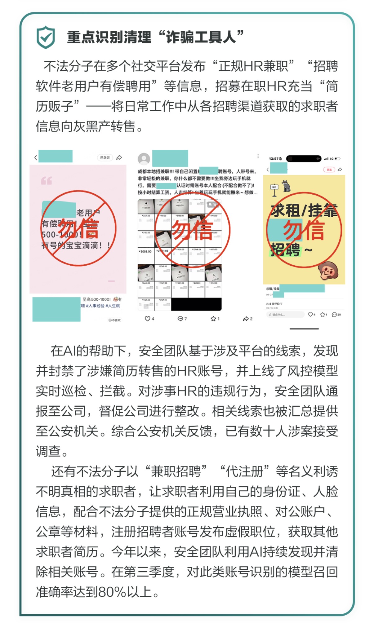 此外,在识别求职者被诱导充当“简历工具人”的场景下,AI模型第三季度的识别准确率已超过80%。