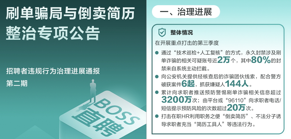 金九银十是招聘求职的传统旺季,一些黑灰产从业者也开始“冲业绩”,利用套路诈骗求职者。10月29日,针对诱导求职者参与“网络刷单”、骗取钱款及倒卖简历等违法行为,BOSS直聘公布了治理进展。