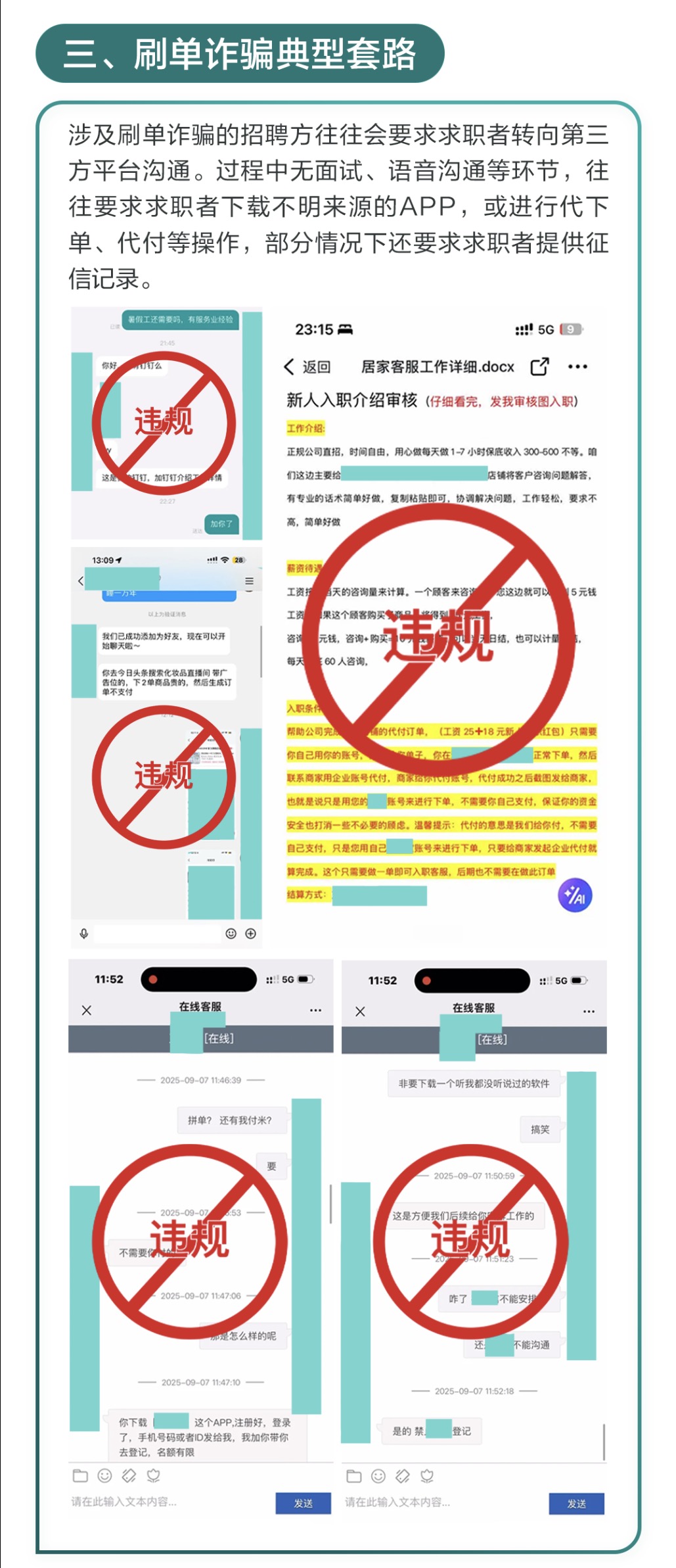 利用李某这样的“简历工具人”非法获取简历,是黑产业的下游,而上游黑产人员获得求职者个人信息后,则可能运用多种诈骗手段牟利;其中假借“刷单招聘”名义的诈骗行为,也被BOSS直聘重点提及:不法分子通过灰黑产渠道获取求职者信息后,通过短信/邮箱发送“面试邀约”,诱导求职者“线上试岗”,试岗内容为下载不明软件后充值刷单。